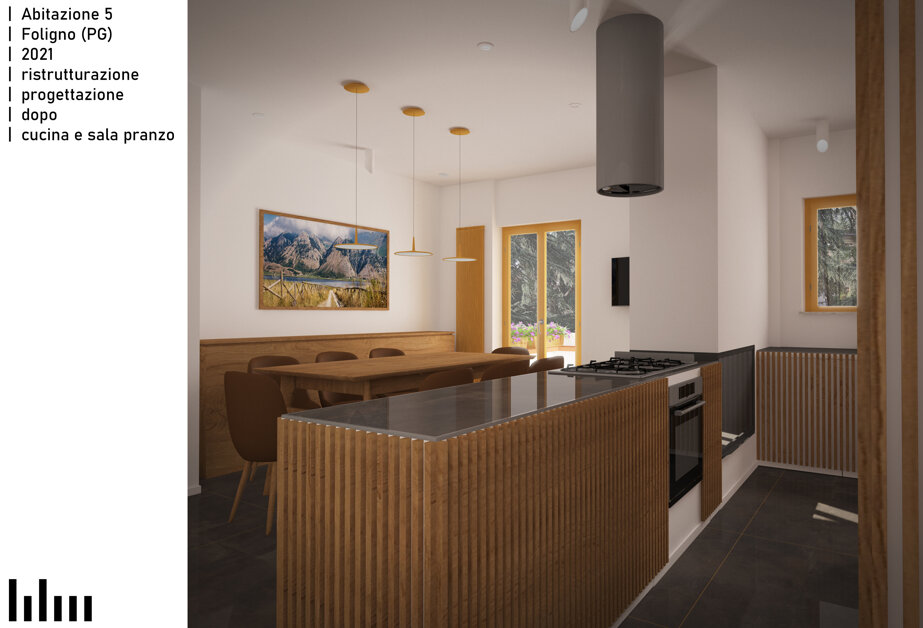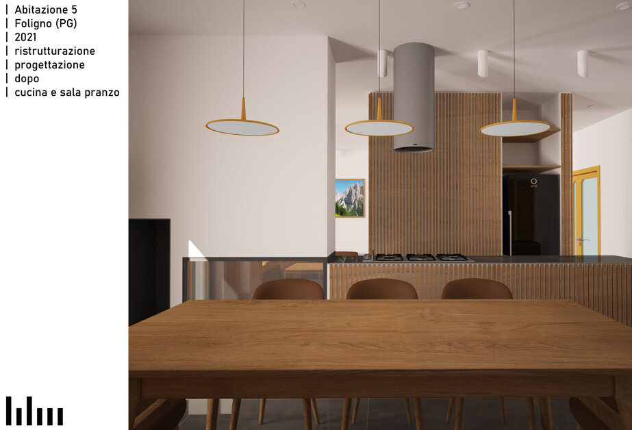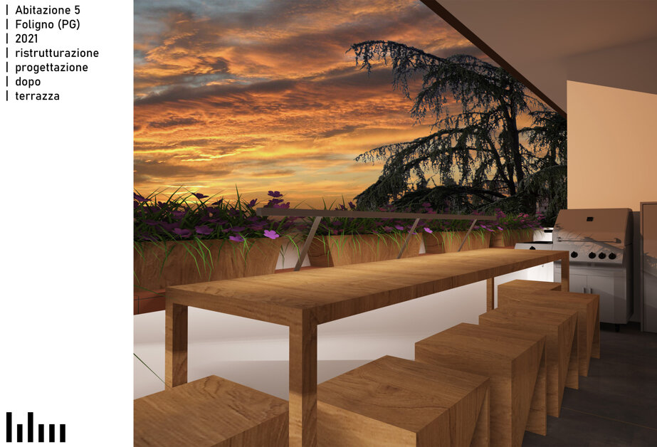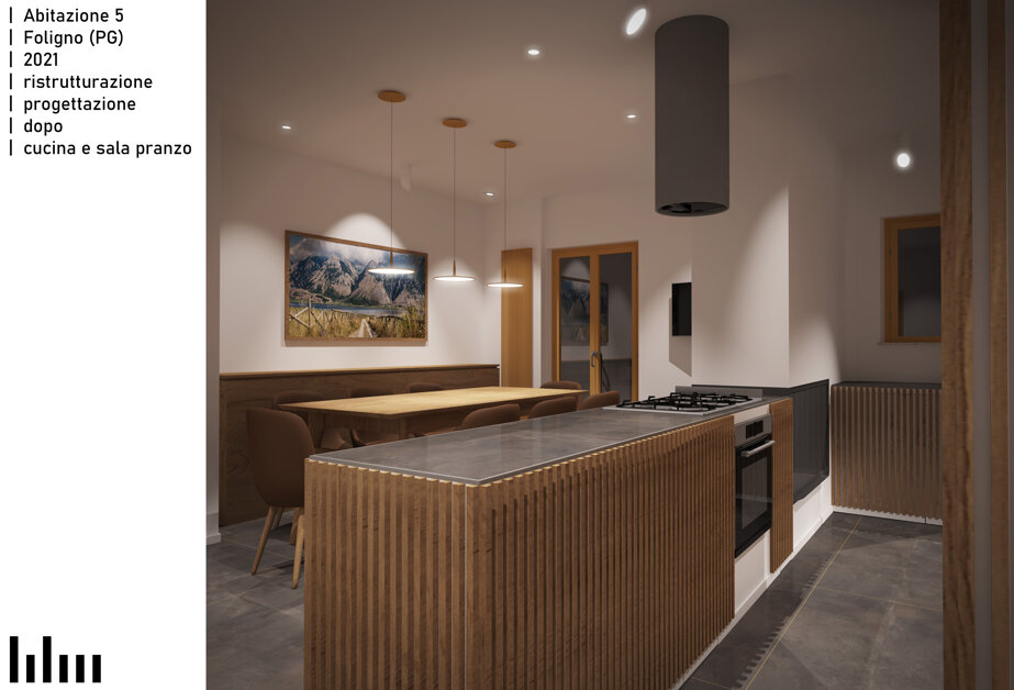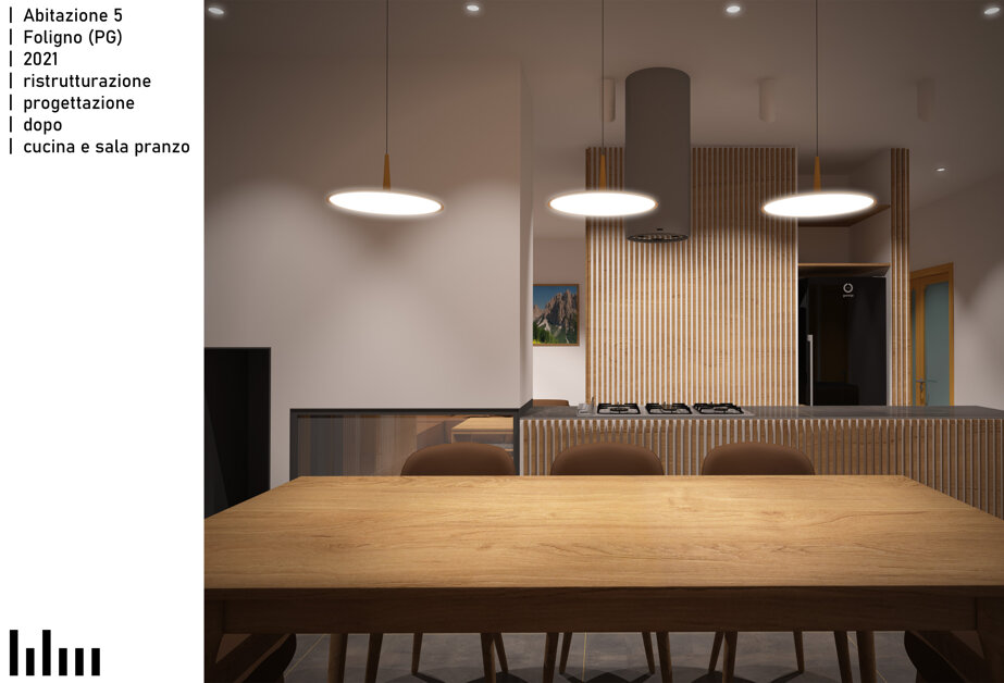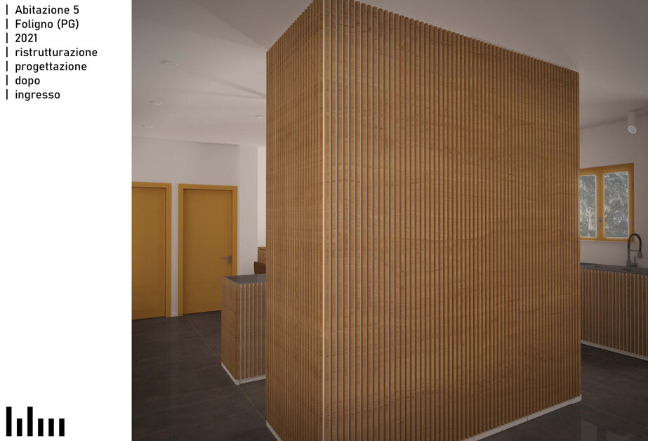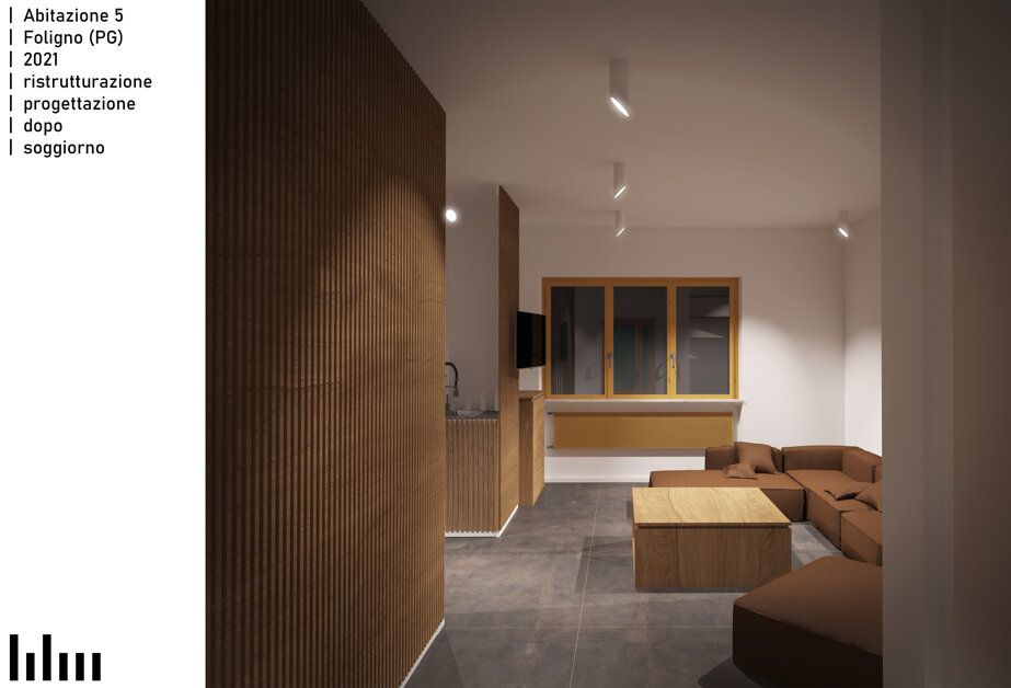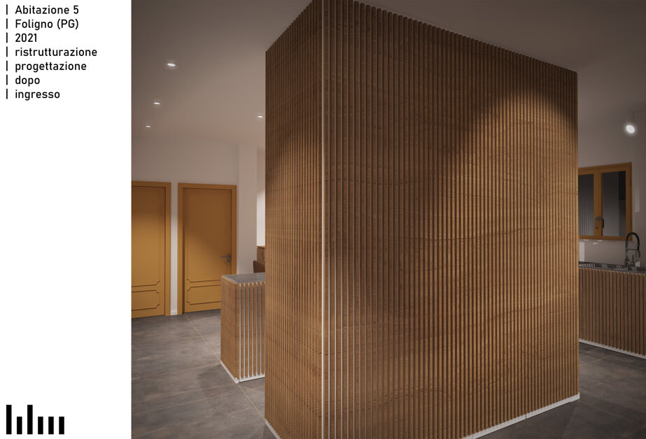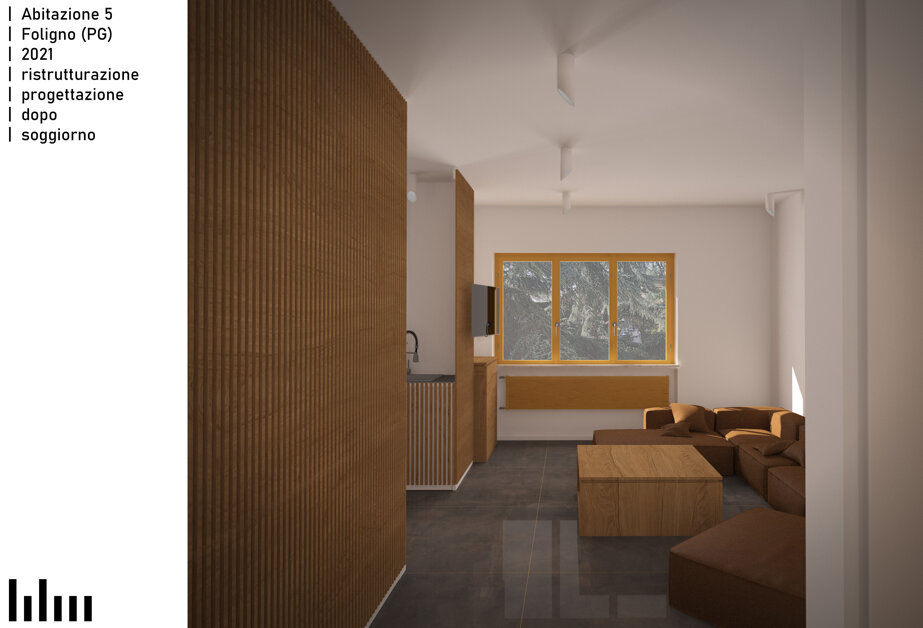 Il progetto consiste nella ristrutturazione di un appartamento di 120 metri quadri in una tranquilla zona residenziale di Foligno. La proposta prevede la rimozione dell'attuale frammentazione degli ambienti, al fine di creare un'unica zona giorno che, pur non presentando dei veri e propri elementi divisori, permetta una chiara leggibilità delle diverse aree funzionali tramite un blocco servizi e ripostigli centrale. Intorno alla zona giorno saranno distribuiti i bagni e le camere. Altro elemento caratterizzante del progetto è la valorizzazione del terrazzo esistente.