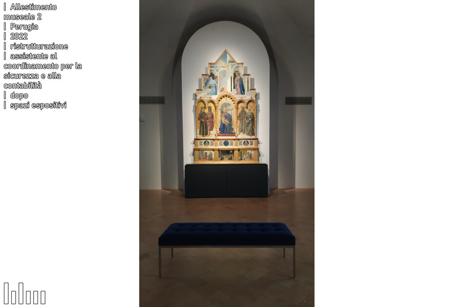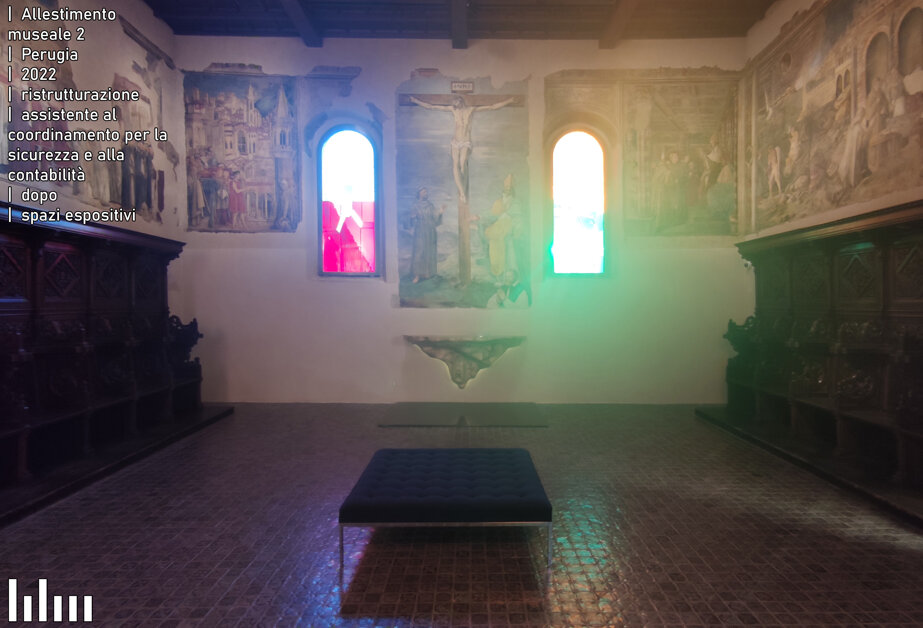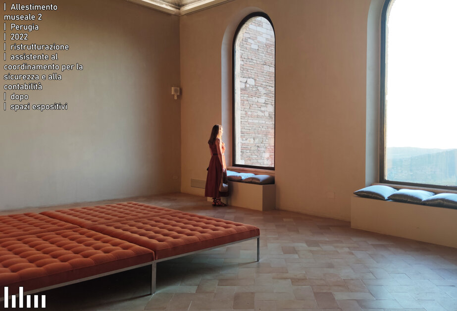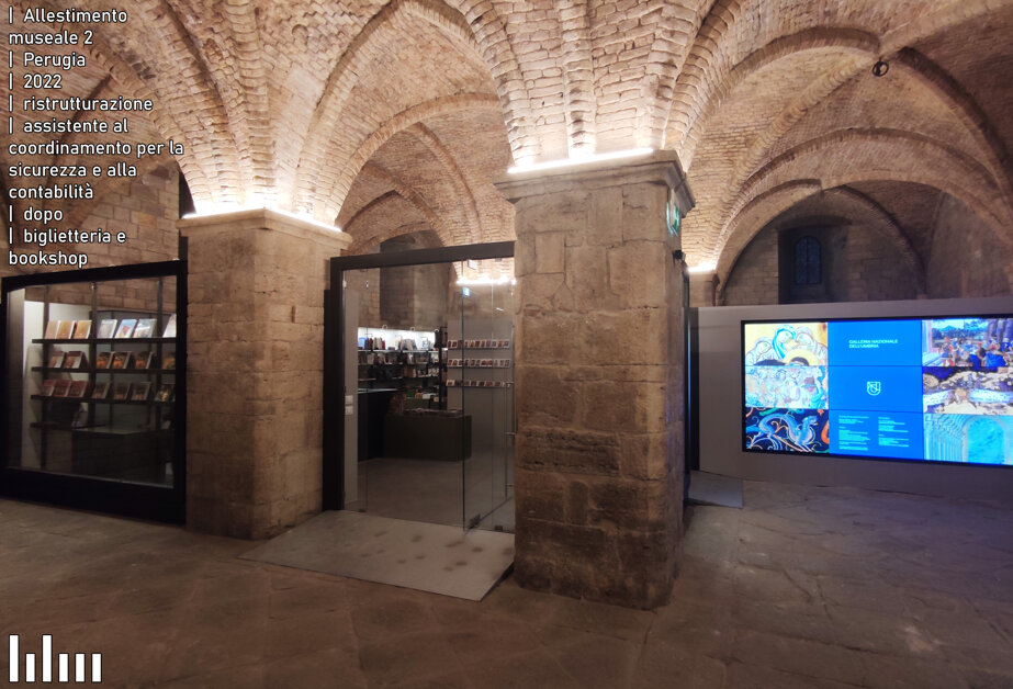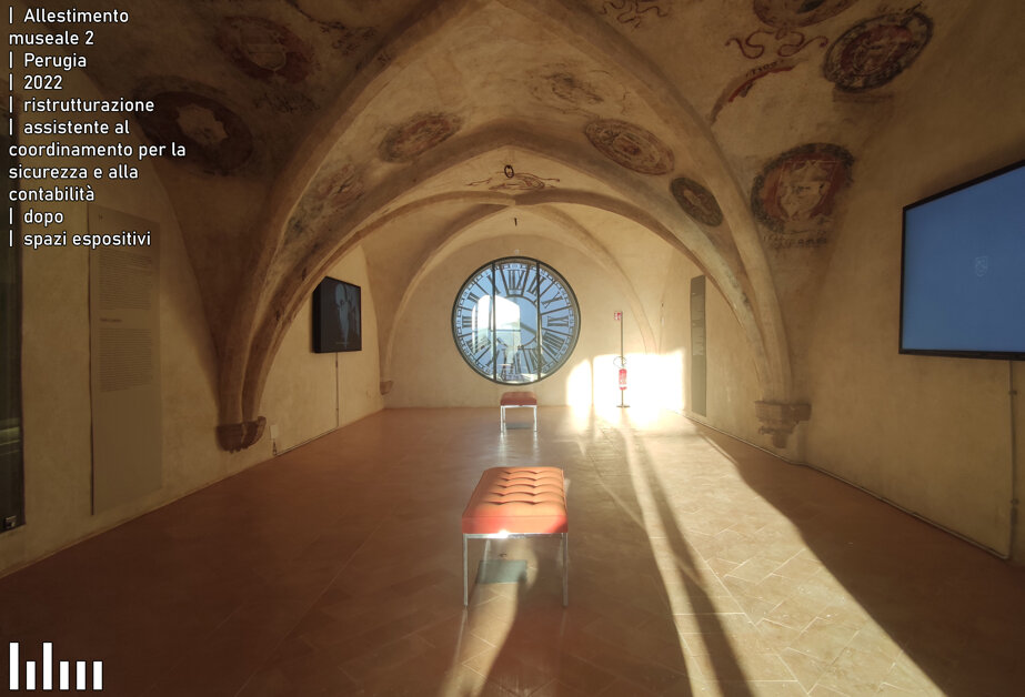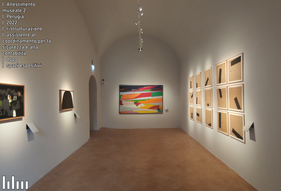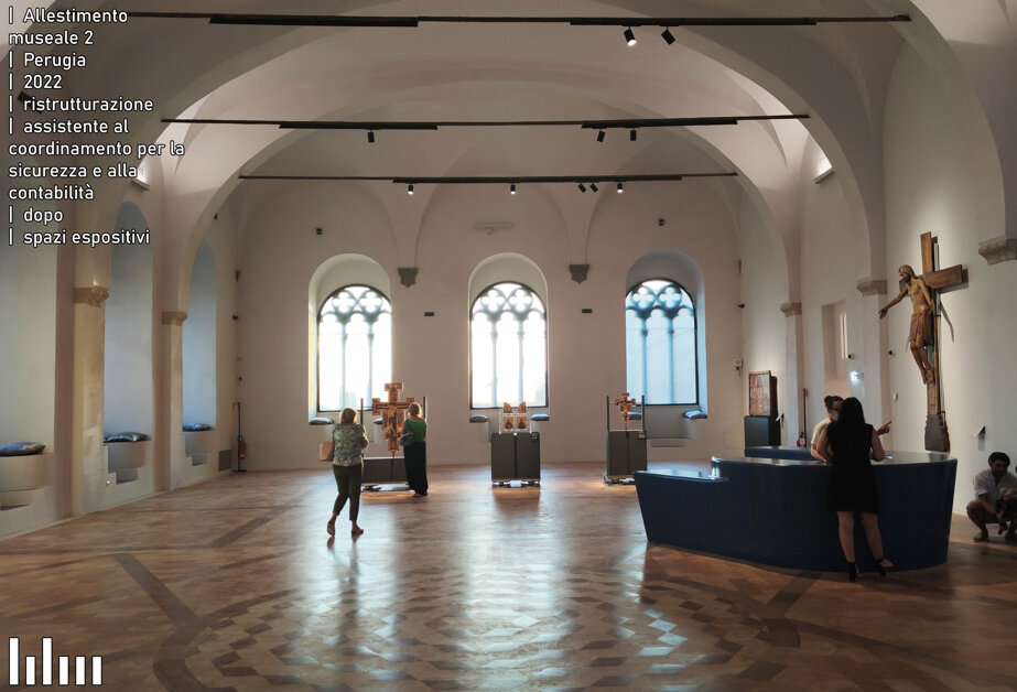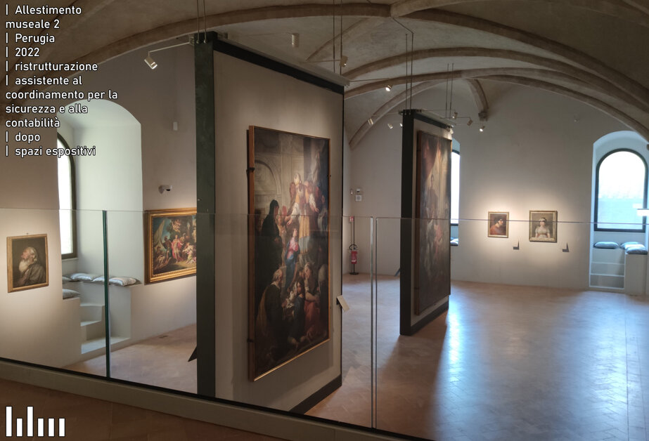 L'incarico svolto si inserisce all'interno dei lavori di ristrutturazione della Galleria Nazionale dell'Umbria, nei quali la nuova configurazione delle opere da esporre ha fornito l'occasione per ripensare il sistema espositivo nel suo complesso. L'intervento eseguito è stato quindi tradotto nella risistemazione ed ammodernamento degli spazi museali e nella realizzazione delle nuove strutture di sostegno delle opere. Tale fase realizzativa fa seguito al concorso di progettazione bandito nel 2018, nel quale il raggruppamento temporaneo di professionisti di cui facevo parte è risultato vincitore. In questo contesto, il ruolo assunto è stato quello di assistente al coordinamento per la sicurezza in fase di esecuzione e alla contabilità.