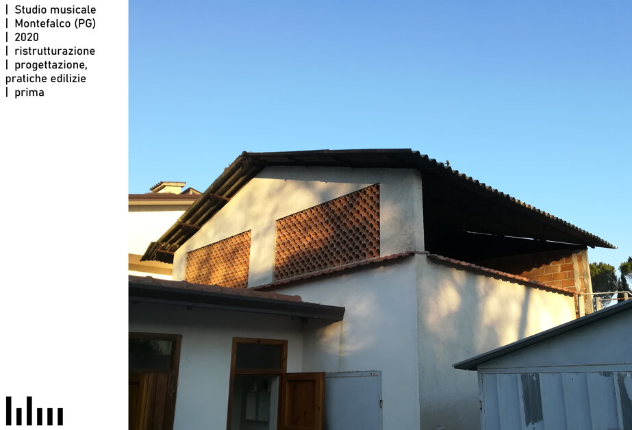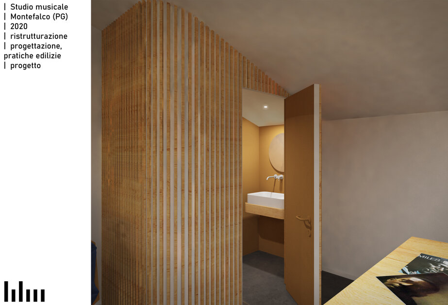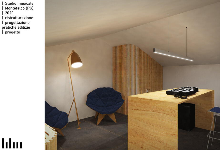Il lavoro svolto consiste nella progettazione e nell'impostazione delle pratiche edilizie finalizzate alla ristrutturazione di un piccolo fienile, trasformandolo in un laboratorio musicale e di registrazione. L'obiettivo era quello di creare un'ambiente confortevole in cui lavorare e accogliere saltuariamente ospiti, mantenendo sempre uno sguardo privilegiato sulla campagna montefalchese.